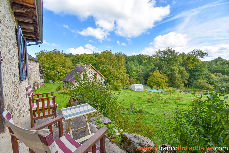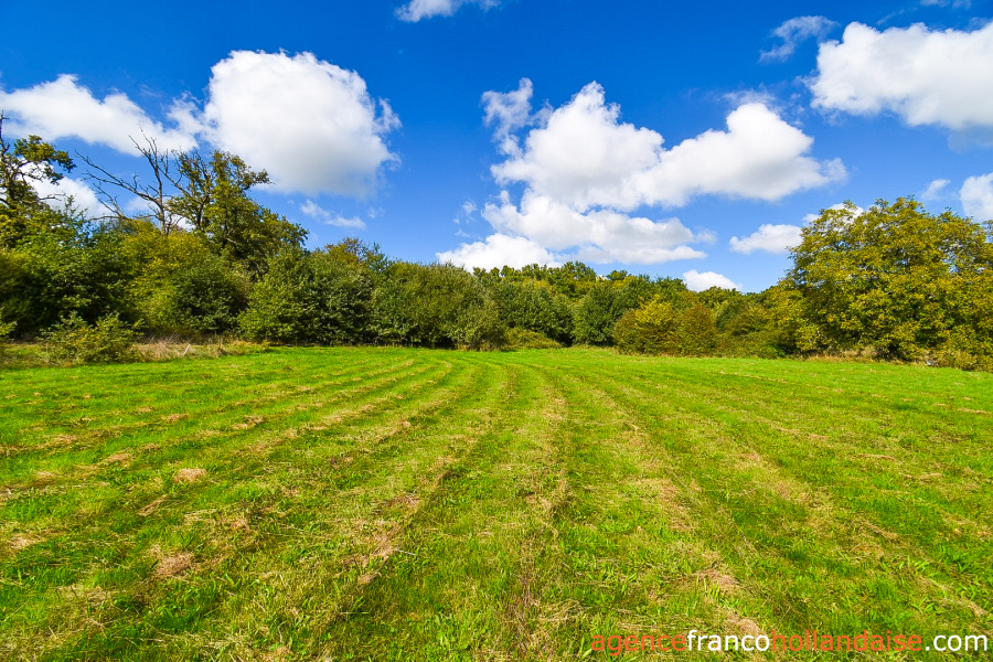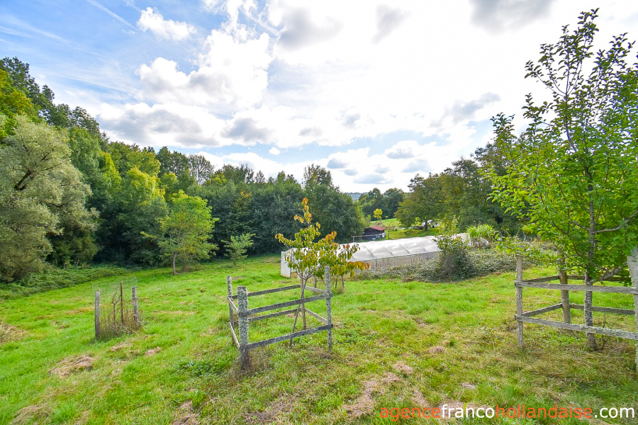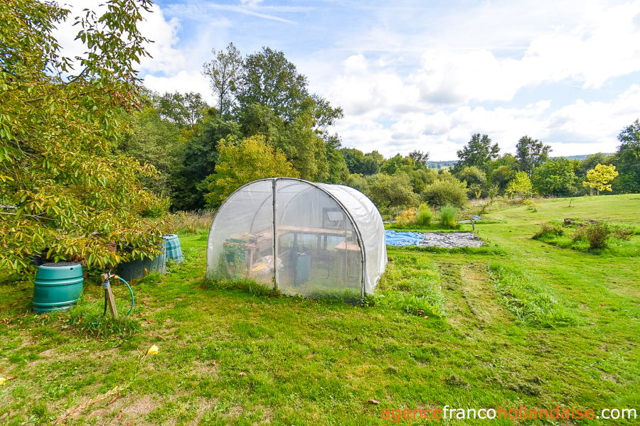 Sur la propriété, on dispose d’un terrain de 6 hectares bien organisé, entièrement clôturé et très varié, puisqu’il incorpore une zone boisée avec tous types d’essences feuillues où coule une source souterraine avec pêcherie, une grande partie en pâturage et une zone maraîchère proche des bâtiments avec une grande serre longiligne pour avoir des légumes toute l’année. Le terrain n’est pas plat, mais en pente raisonnable et la vue depuis les bâtiments sur la campagne vallonnée et boisée environnante est magnifique. L’impression immédiate à votre arrivée sera positive, on vous le garantit. En arrivant à la propriété, on remarque un voisin de l’autre côte de la route, puis on l’oublie très vite car il est invisible dès qu’on est sur le terrain.
