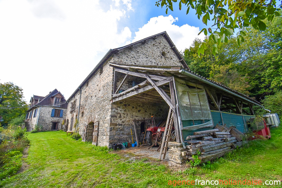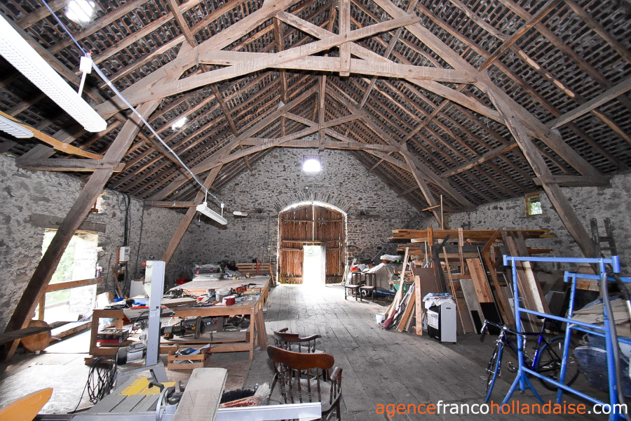 Située entre les deux habitations, une grande grange auvergnate en pierres de 20x11 mètres avec toiture en ardoises. L’entrée principale se fait à plat par le pignon sud-ouest au niveau du rez-de-chaussée sur un grand espace cathédrale. On peut tout ranger, des animaux, du fourrage, des véhicules et il y a une grande porte à foin côté jardin. En rez-de-jardin, plusieurs étables avec belle hauteur sous plafond, parfaites pour tous types d’animaux ou de matériels. Un appentis de 11x5m adossé au pignon nord-est de la grange permet de ranger son ou ses tracteurs, si on en a ! C’est dire s’il y a de la place…
