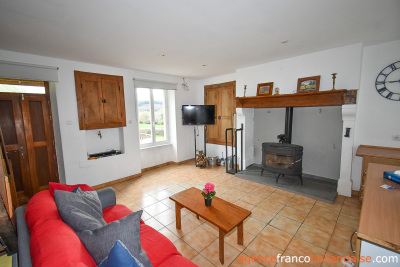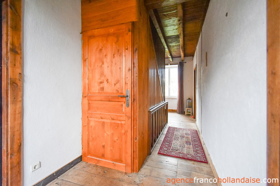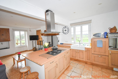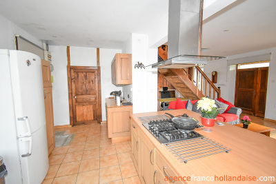 L’habitation ne ressemble pas aux petites fermettes avec grange attenante de type longère qu’on a l’habitude de voir dans notre région, mais plutôt à une maison bourgeoise/de village plus haute et plus lumineuse, avec une grange accolée. Elle dispose de deux entrées. L’entrée principale, côté sud et l’entrée secondaire, côté nord en passant par une terrasse couverte de 17m². On pénètre dans la maison sur un agencement simplifié au rez-de-chaussée, car les anciennes cloisons qui formaient auparavant 4 pièces, ont été retirées. On profite désormais d’une pièce de vie en forme de « L » (env. 57m²) avec escalier apparent en chêne massif, coin cuisine et son îlot central, coin salon avec de jolis placards en boiseries pleine hauteur et coin salle à manger avec poêle à bois dans la cheminée et grands placards encastrés. Puis, une buanderie (env. 11m²) avec évier, rangements, électroménager, ballon d’eau chaude et WC, complète l’agencement de ce niveau.
