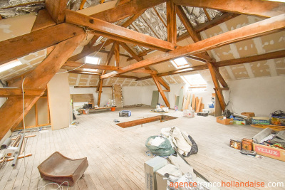 Un escalier fermé part du palier pour atteindre un grand loft ouvert sous les toits à finir d’aménager (env. 68m²), éclairé de plusieurs Vélux et incluant les prémices d’une salle d’eau.
