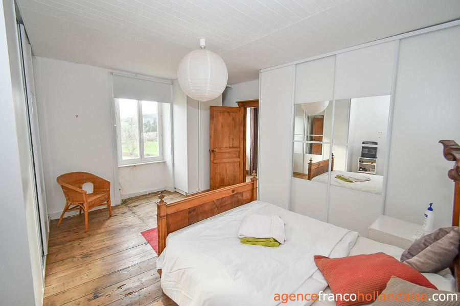 La propriété étant située en bordure de hameau au nord, on profite de superbes vues ininterrompues vers le sud et l’ouest de la propriété. Ici, pas d’agriculture intensive, mais des étendues boisées, des collines et des prairies où paissent tranquillement les vaches Limousines, célèbres pour leur viande goûteuse ! La majeure partie du terrain se trouve devant la maison, côté sud et se compose de pelouse parsemée d’arbres fruitiers. Derrière la maison et la grange, une pelouse quelque peu en friche d’environ 700m², plus surélevée qu’à l’avant, rejoint le terrain du voisin situé derrière, dont il est séparé par une clôture et une haie.