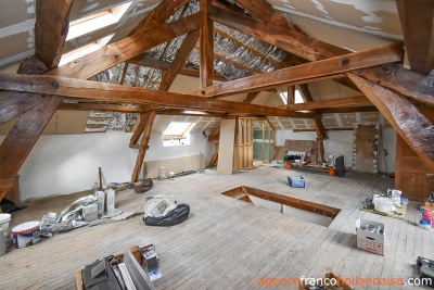 Accolée à la maison, mais bénéficiant d’un accès indépendant de celle-ci, une magnifique grange aux murs extérieurs entièrement rejointés (non, pas seulement la façade avant visible des passants, comme c’est souvent le cas) a bénéficié d’un plancher béton dans l’étable et d’un sol pavé sur le sol de la grange ouverte, ainsi que de la rénovation complète de sa toiture, tuiles et charpente comprises. Elle a une surface au sol d’environ 115m², avec, en plus, une mezzanine en bois au-dessus de l’étable d’environ 35m². Sa porte de grange a été remplacée par un grand portail roulant électrique très pratique. Elle sert actuellement de (grand) lieu de stockage, mais pourrait, sujet à autorisation, être aménagée par son futur propriétaire, car elle est alimentée en eau et électricité.