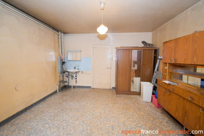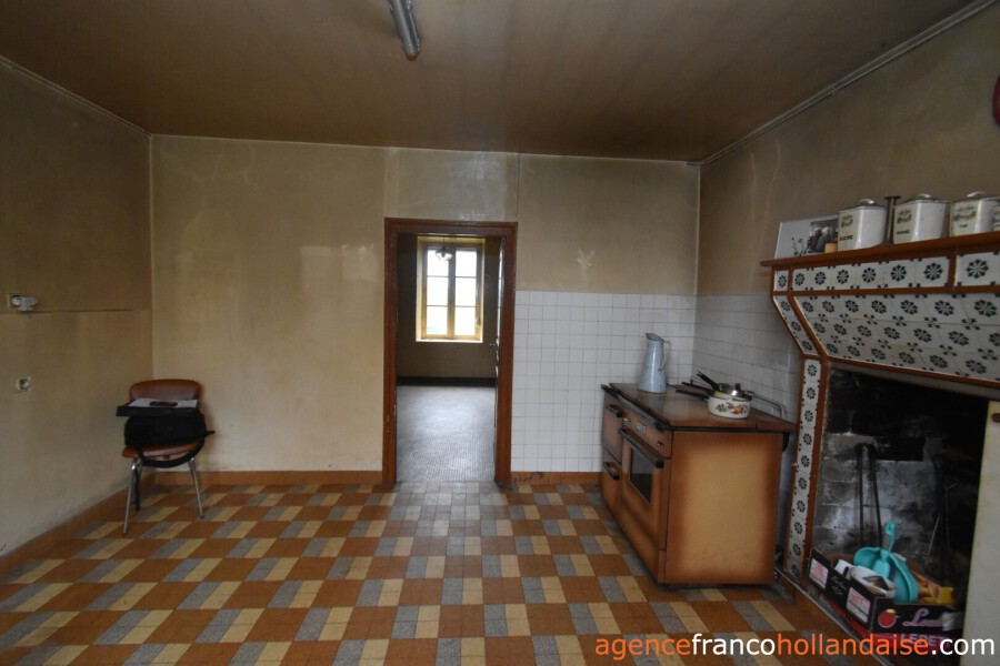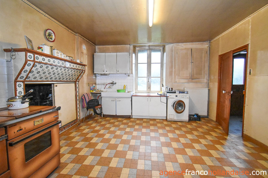 Il s’agit d’une belle maison indépendante offrant plus de cachet que les longères que l’on connait dans notre région. Avec sa façade avant orientée sud-ouest crépie, son « chien assis » plein de cachet, typique des constructions en pierres des années 1920-1930, on profite au rez-de-chaussée, élevé aux ¾ sur cave, d’un palier d’entrée central avec accès sud et nord, un cabinet de toilette et un escalier vers la cave (env. 13m²). A sa gauche, un séjour traversant carrelé sur hourdis avec poêle (env. 31,5m²). A sa droite, une cuisine (env. 16,5m²) sur terre-plein avec cheminée équipée d’une cuisinière au bois dite « bouilleuse » alimentant le chauffage central. En enfilade de cette pièce, une salle à manger (env. 14,5m²) au sol carrelé en fine mosaïque sur hourdis.