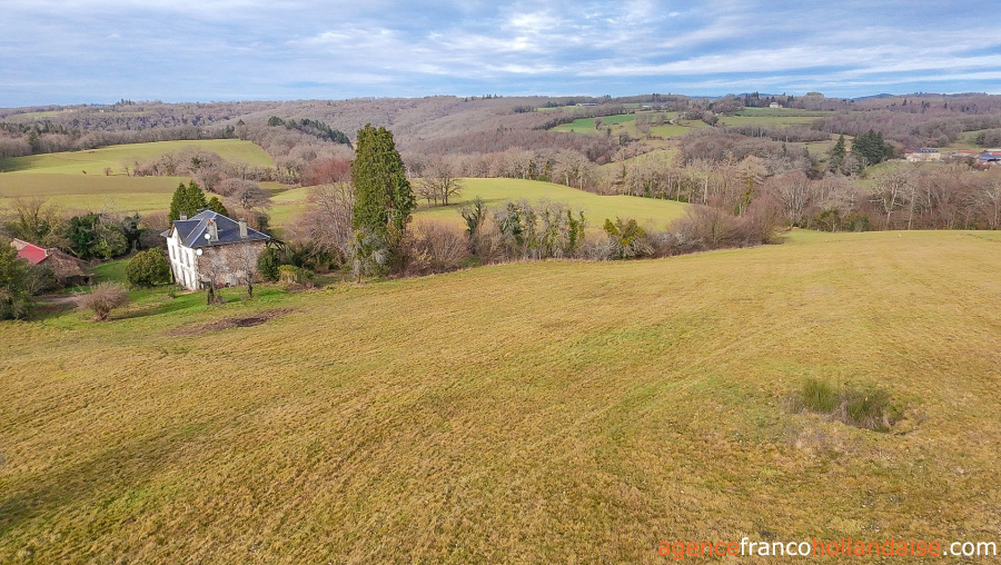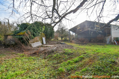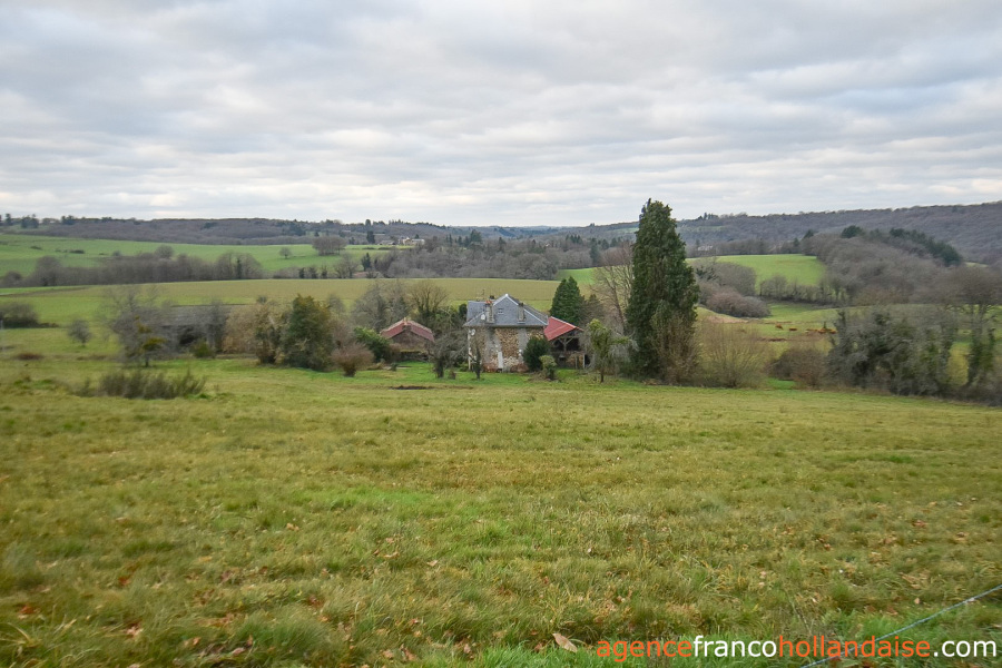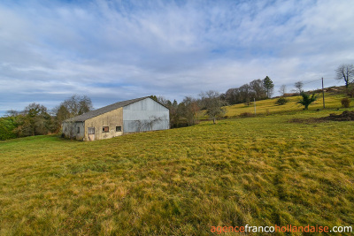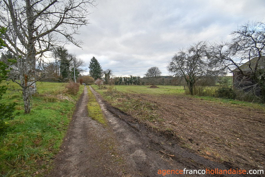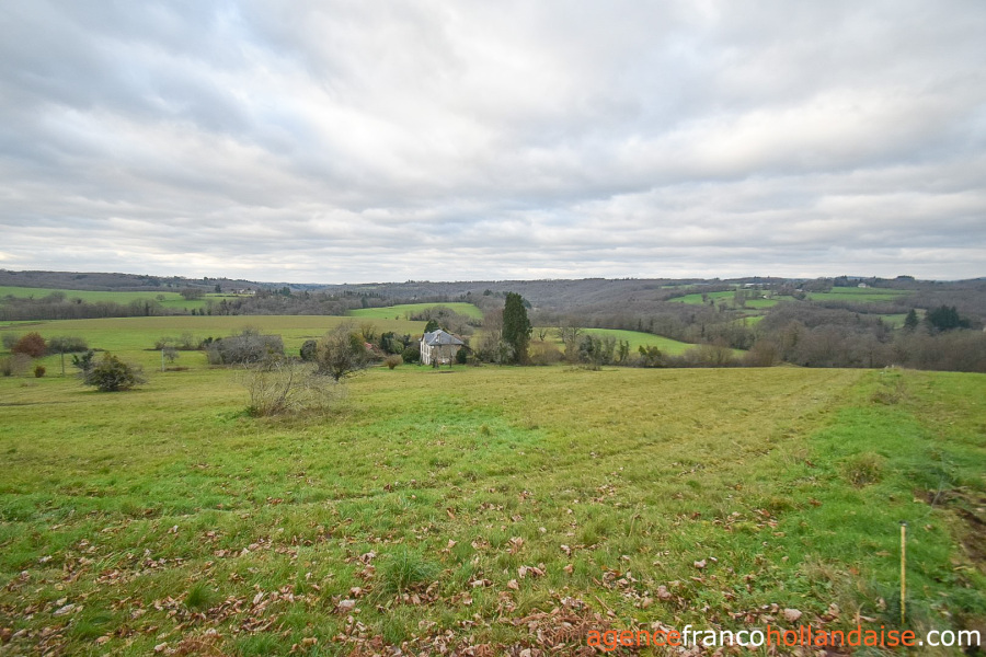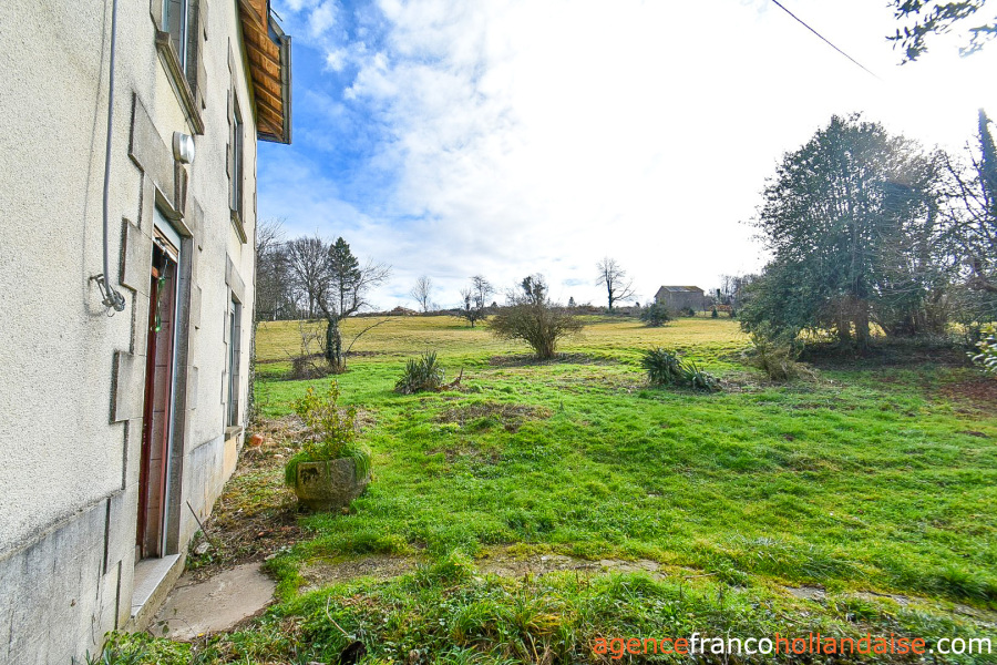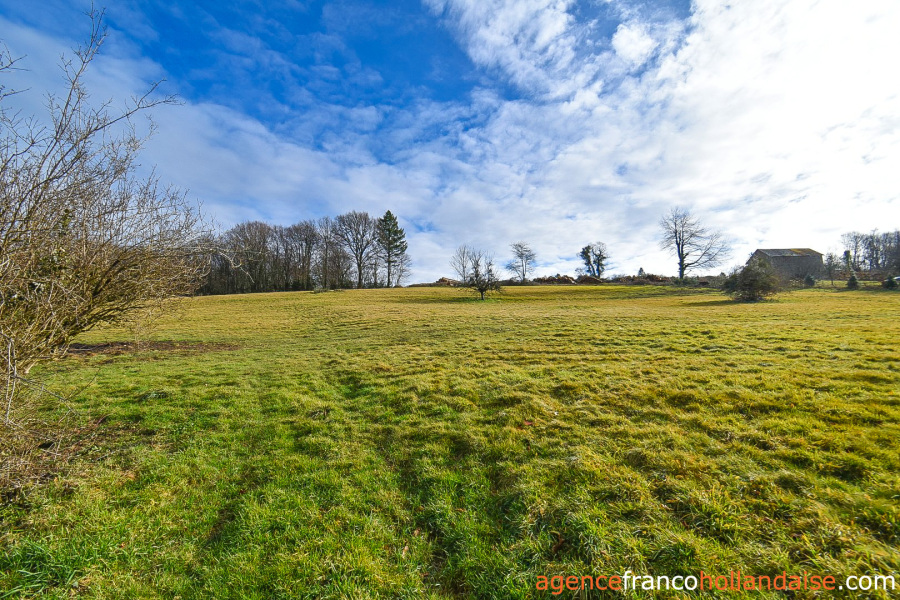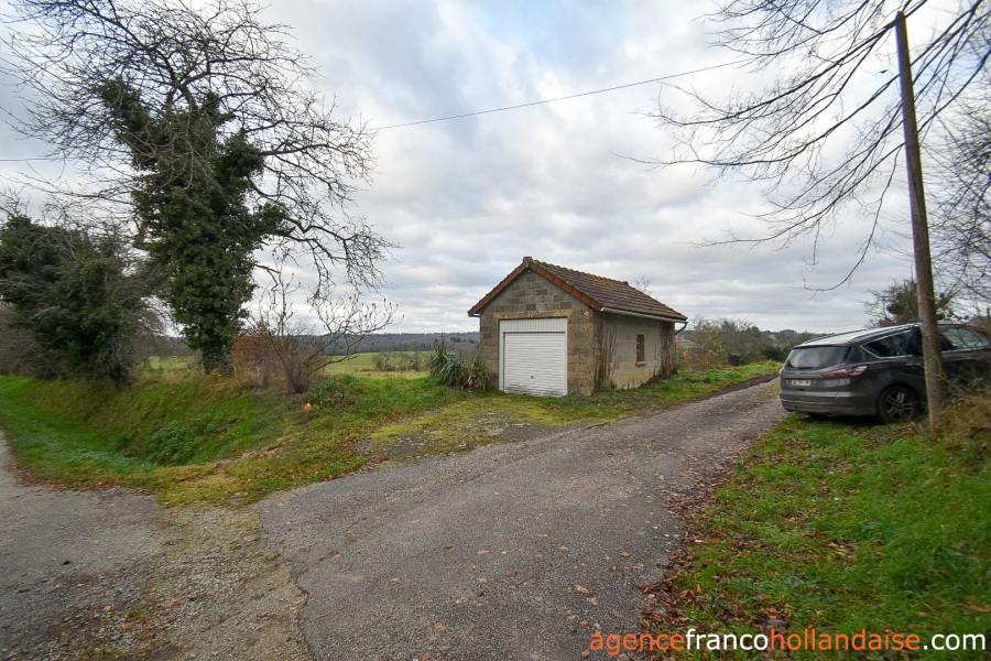 La propriété dispose d’un grand terrain en pente sur sa partie est et plus plate sur sa partie ouest, composé presqu’uniquement de pâtures d’une surface d’un seul tenant d’un peu moins de 4 hectares non-clôturés, mais entourés de pâturages loués. A l’entrée du terrain, un garage (env. 6x4m) en parpaings avec porte électrique télécommandée et toiture en tuiles, permet de garer une voiture, même si elle est longue. Bénéficiant d’un droit d’eau, la source de la maison est captée sur une parcelle boisée voisine. Elle est canalisée vers une réserve d’eau enterrée à mi-pente de 1600 litres, puis plusieurs canalisations amènent l’eau vers la maison et les dépendances. La maison d’habitation se trouve à environ 100 mètres de la route du hameau et environ 200 mètres des voisins les plus proches, mais elle est protégée de tous vis-à-vis par des arbres et des haies de feuillus. Les parties du terrain orientées au nord et à l’ouest, exemptes de toute habitation, disposent d’une vue dégagée sur la campagne limousine vallonnée. On est à une altitude d’environ 350m, mais le terrain continue de descendre plus loin à l’ouest vers un ruisseau se jetant dans la Vienne à moins d’un kilomètre de là.