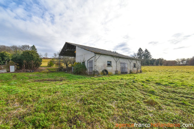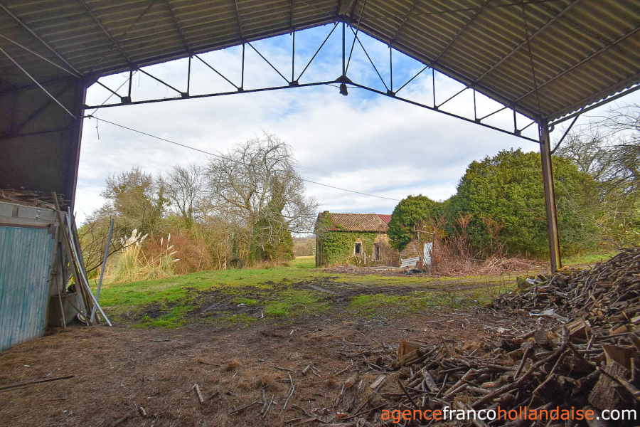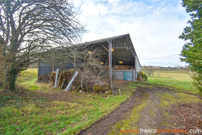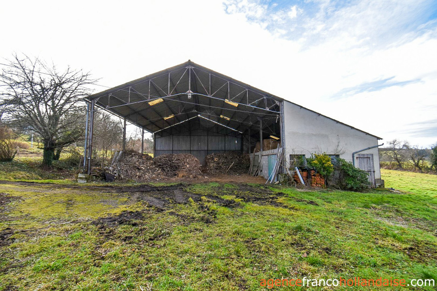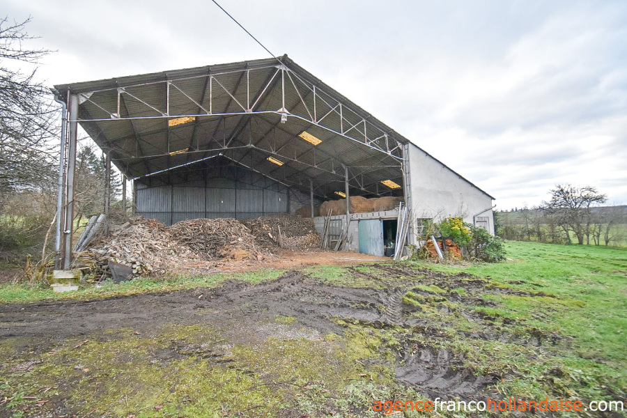 Plus éloigné de la partie ancienne du bâti de la propriété, un grand hangar à matériel avec stabulation fermée à ossature métallique et toiture en fibrociment, offre une surface au sol combinée de plus de 300m². Si on le ferme complètement, on peut garer de nombreux véhicules, commencer une collection ! La stabulation était destinée aux vaches, les mangeoires en béton sont encore là.