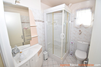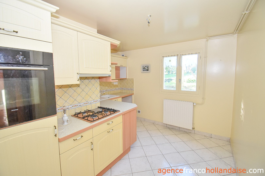 La maison est élevée sur un rez-de-jardin comprenant une entrée/palier carrelée orientée à l’est, avec placards encastrés (env. 8m²), distribuant, à sa gauche, vers un bureau/chambre supplémentaire (env. 10m²) sur planchers de châtaignier, un dégagement « borgne » au sol carrelé avec rangement sous la cage d’escalier (env. 7,5m²). On débouche alors sur la partie arrière de la maison, côté ouest, plus récemment aménagée, reconnaissable par son sol carrelé clair à plus grands carreaux. Un deuxième dégagement (env. 3m²) donne accès, à sa droite, à une deuxième chambre (env. 10,5m²), une salle de bain équipée (env. 4m²) avec WC, cabine de douche, meuble-vasque et sèche-serviettes, une cave/cellier avec sol gravillonné (env. 3m²) et une cuisine aménagée, équipée d’un évier, d’un four encastré et de plaques de cuisson. Devant la cuisine, le garage abrite la chaudière de 2014 du chauffage central au gaz de la maison. Ce garage (env. 17,5m²) est moins grand qu’à l’origine, puisqu’il a été divisé pour créer la cuisine, mais il reste une surface d’environ 4,85m x 3,3m pour mettre à l’abri un véhicule de taille moyenne. Il dispose également d’une porte coulissante verticale motorisée avec porte piétonne intégrée.
