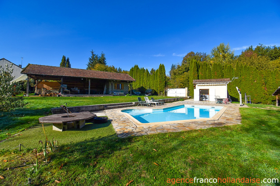 Depuis la pièce à vivre, on accède à une grande terrasse pavée exposée sud-ouest avec, en son centre, la piscine enterrée (11m x 4m). Elle est alimentée par une source privée qui vous assurera de l’eau toute l’année. En prolongement, un large espace détente pavé en pierres, au bout duquel se trouve le poolhouse (env. 14m²) abritant la filtration de la piscine et la pompe avec réserve d’eau de la source.