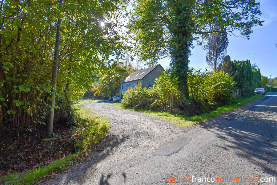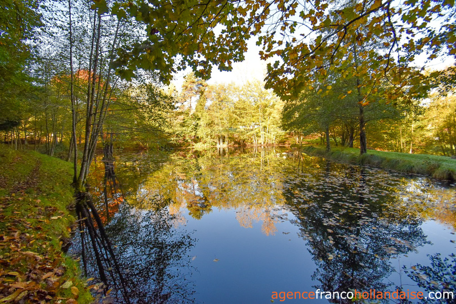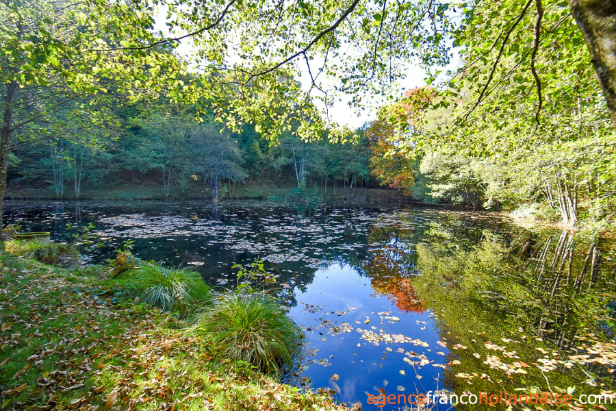 En contrebas de l’ensemble bâtiments-piscine, un petit étang (env. 2000m²), alimenté lui-aussi par une source, et une zone plate propice à la culture. L’étang est en partie ombragé par une zone boisée, elle-même adossée à un bois voisin. Enfin, côté nord-est de la maison, se trouve l’accès pour les voitures et un grand parking privé pour plusieurs véhicules.