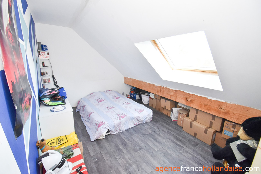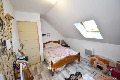 On accède au 1er étage, aménagé sous rampants isolés, par la mezzanine de la pièce à vivre. Un couloir central distribue vers 4 chambres (env. 10,5m², 8m², 7,5m² & 7,5m²), une salle d’eau, un WC séparé et un débarras (env. 4,5m²). Toutes les menuiseries extérieures sont en alu double vitré.