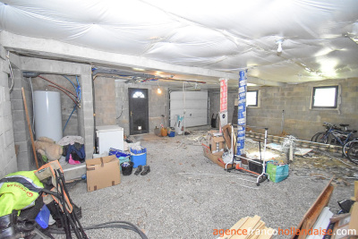 L’entrée principale se trouve sur la façade nord-ouest en sous-sol, dans la partie basse du jardin. Ce niveau se compose d’un grand garage (env. 73m²) avec un réduit pour le ballon d’eau chaude sous la cage d’escalier et un vide-sanitaire (env. 38m²). Au rez-de-chaussée, on trouve une entrée secondaire par une grande baie vitrée coulissante dans la grande pièce à vivre « cathédrale » (env. 65m²) avec poêle à bois central (16Kw) en forme de « L ». Cette pièce se divise en une partie cuisine aménagée ouverte sur un salon et une salle à manger. Juste à côté, un sas (env. 2m²) avec rangements vous mène aux toilettes équipées d’un lave-main (env. 3,5m²). A droite de la pièce à vivre, une suite parentale (env. 32m²) avec chambre traversante (nord-est/sud-ouest) et salle de bain privative pourvue d’une baignoire, d’une douche, d’un meuble double-vasque et d’un sèche-serviette électrique.