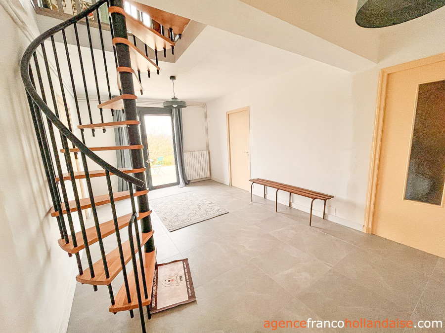 Un escalier en colimaçon part de l’entrée et débouche au rez-de-chaussée dans le séjour spacieux (env. 31m²) avec poêle sur plancher en châtaignier massif. Deux fenêtres vous font profiter d’une belle vue sur la campagne environnante. Un couloir/dégagement (env. 10m²) sépare cette pièce de la cuisine aménagée côté nord (env. 10m²), de la salle de bain avec WC indépendant et placards (env. 8,5m²), d’une 3ème chambre côté nord (env. 9,5m²) et d’une 4ème chambre (en. 15m²) côté sud. Au bout du couloir, sur le pignon est, un débarras (env. 2m²) et, à l’autre bout, côté ouest, une porte vitrée s’ouvre sur une grande véranda chauffée (env. 20m²), lumineuse grâce à son mur en baies vitrées et ses 3 Vélux, et profitant de belles vues côtés ouest et sud. Une grande porte d’entrée coulissante donne accès au préau carrelé et à l’escalier extérieur couverts (env. 13m²) à l’arrière de la maison, côté nord.